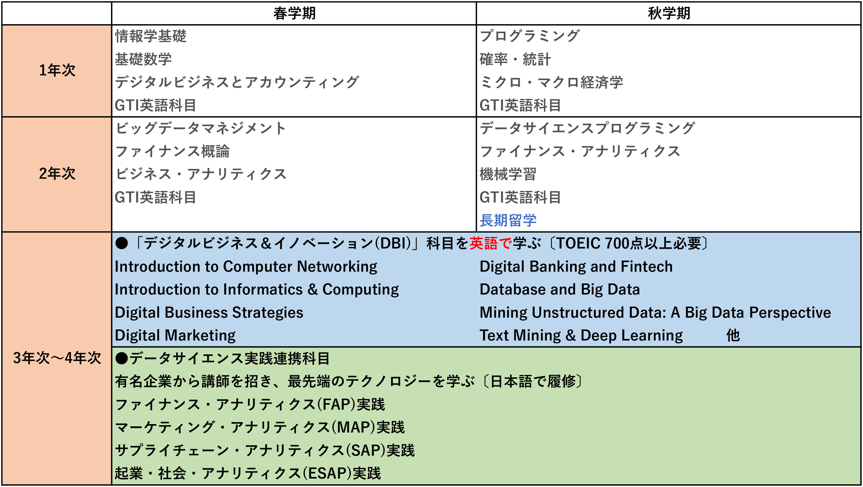 3年次以降はTOEIC®700点以上を前提に、IoT、AIなどの最先端デジタルテクノロジーやデジタルマーケティング、実践的なイノベーション事例について、100を超える国(地域)からの留学生とともに、英語でデータサイエンスを学びます。実際に履修する科目はE-Trackのデジタルビジネス&イノベーション(DBI)設置科目になります。