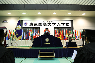続いて、倉田信靖理事長・総長より「東京国際大学の教育理念は、『公徳心を体した、真の国際人の養成』であります。世界の人々が日本を訪れたときの印象として語られるのは『おもてなしの心』に感動したことです。本学の教育理念『公徳心』とは、まさに『おもてなしの心』に具象化された人間相互の『和』の心にあります。諸君は、この日本の『和の心』を教育理念とする東京国際大学において、専門の知識を学び、広く国際社会に活躍の場を拡げて下さい」と新入生の前途を祝しての式辞が述べられました。