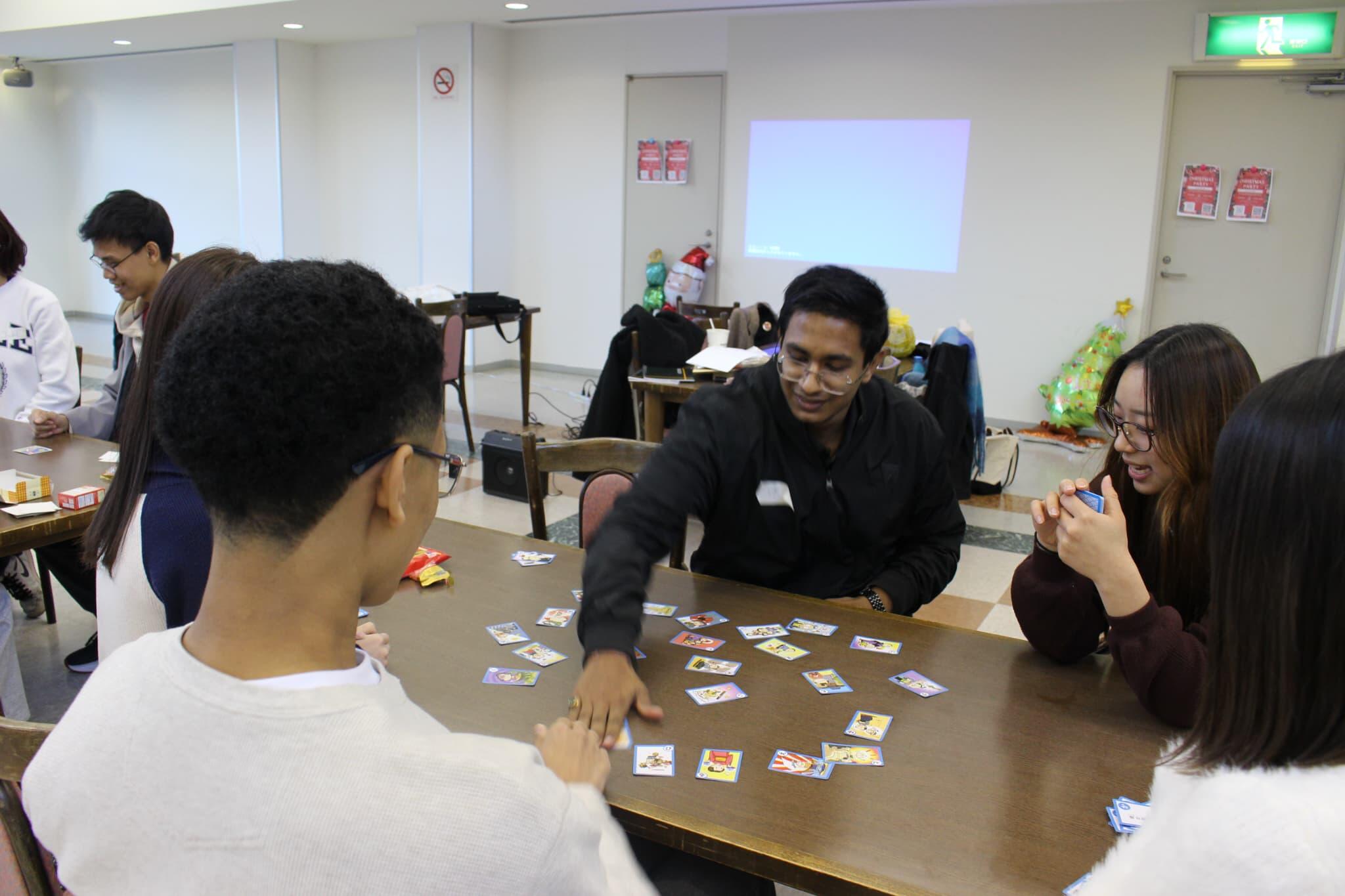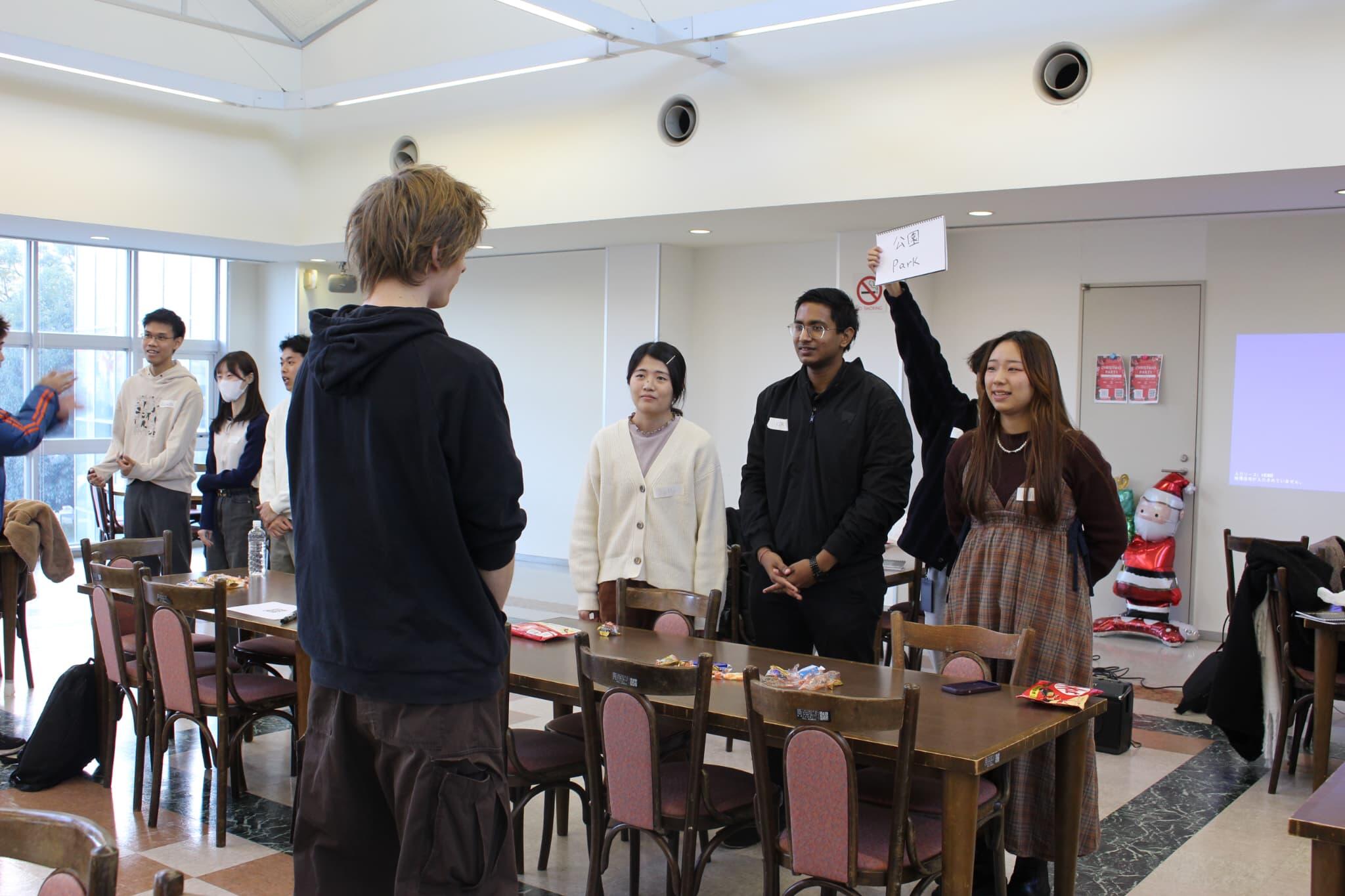 当日は、国内外のヒット曲を使ったクリスマスソングの「イントロクイズ」や連想ゲーム、カルタなどを実施。楽しみながら自然に交流を深め、日本文化を体験する機会となりました。また、英語を用いたコミュニケーションも活発に行われ、終始和やかな雰囲気に包まれていました。