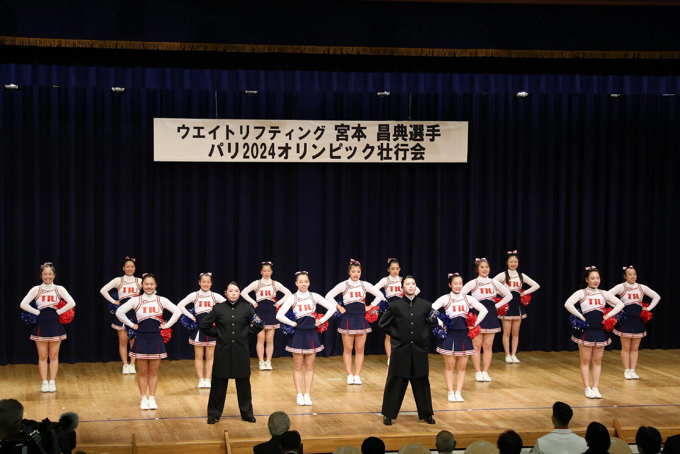 7月3日(水)、パリ2024オリンピックのウエイトリフティング男子73kg級に出場する宮本昌典選手の壮行会を川越第1キャンパス大講堂で執り行いました。チアリーディング部と吹奏楽団は宮本選手の活躍を祈念して応援パフォーマンスを行いました。